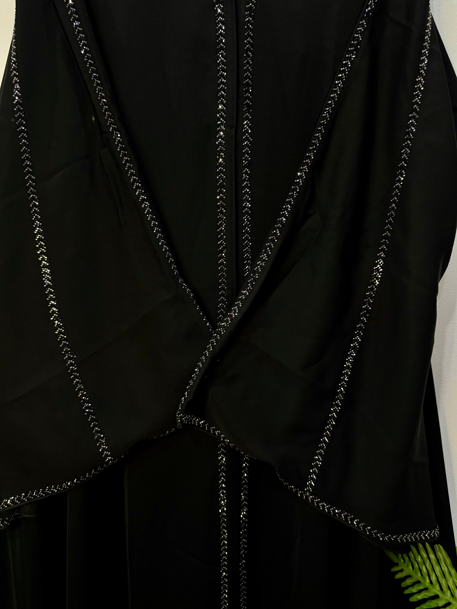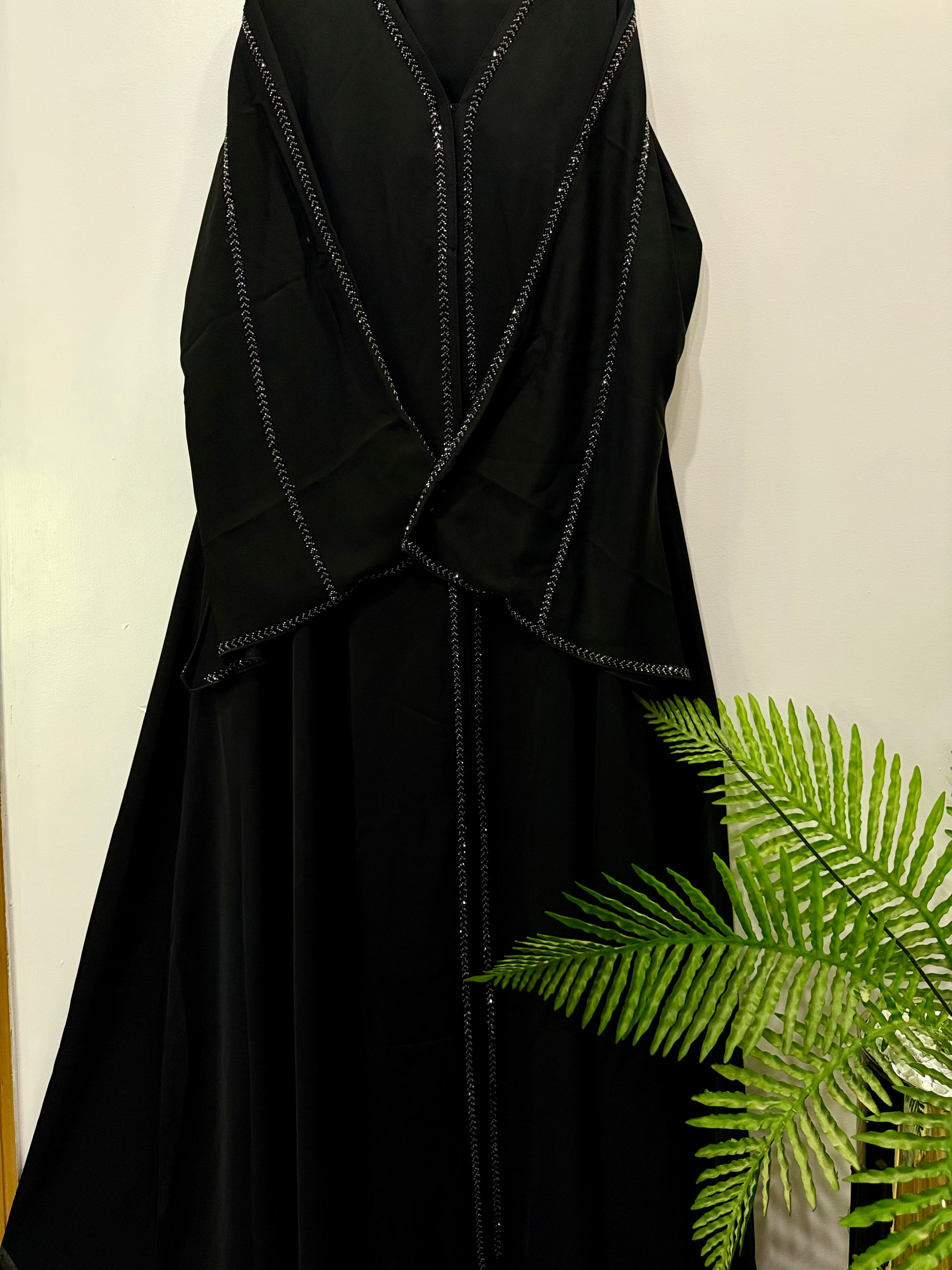 Step into timeless sophistication with this moon light abaya designed with a flowing silhouette for both comfort and elegance. This abaya features delicate silver stitch detailing along the sleeves and front, adding a refined touch of luxury. This look is perfect for formal gatherings, evening events, or special occasions. It has premium quality fabric – lightweight & breathable.