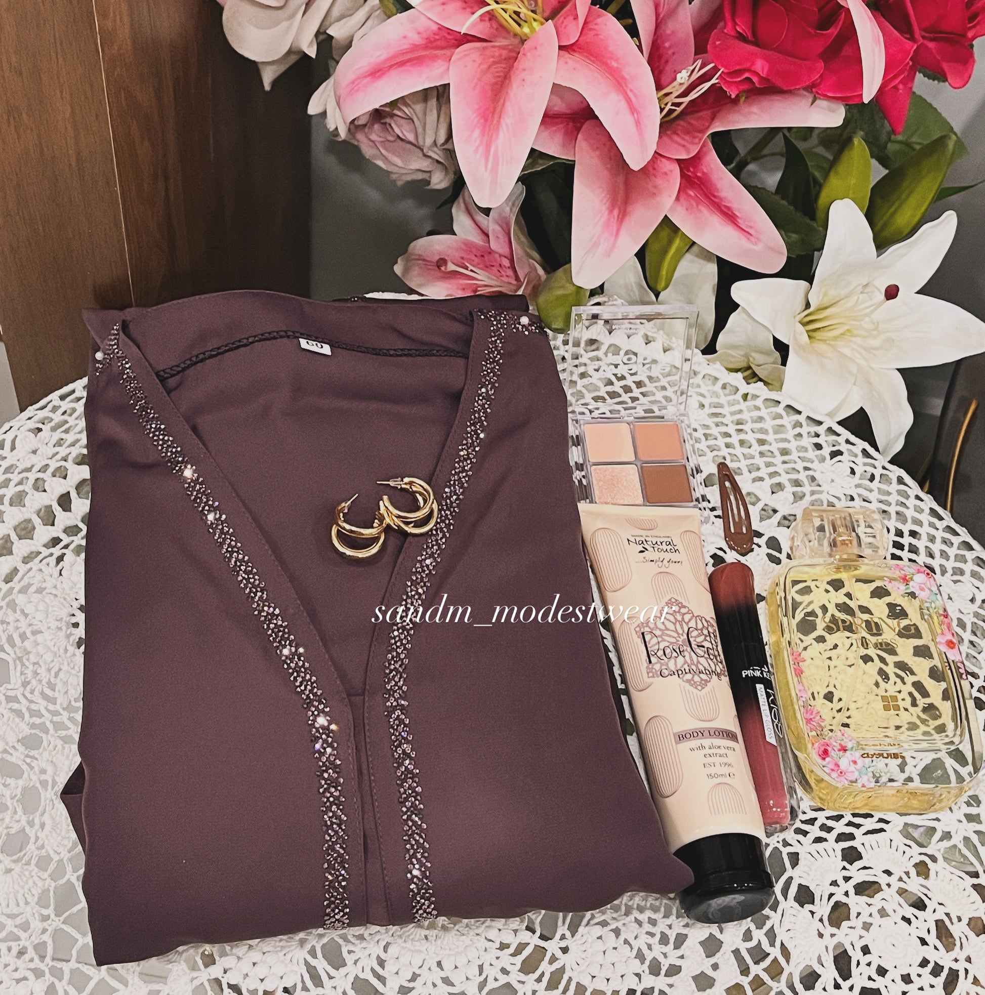 Step into timeless sophistication with this moon light abaya designed with a flowing silhouette for both comfort and elegance. This abaya features delicate silver stitch detailing along the sleeves and front, adding a refined touch of luxury. This look is perfect for formal gatherings, evening events, or special occasions.