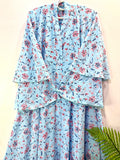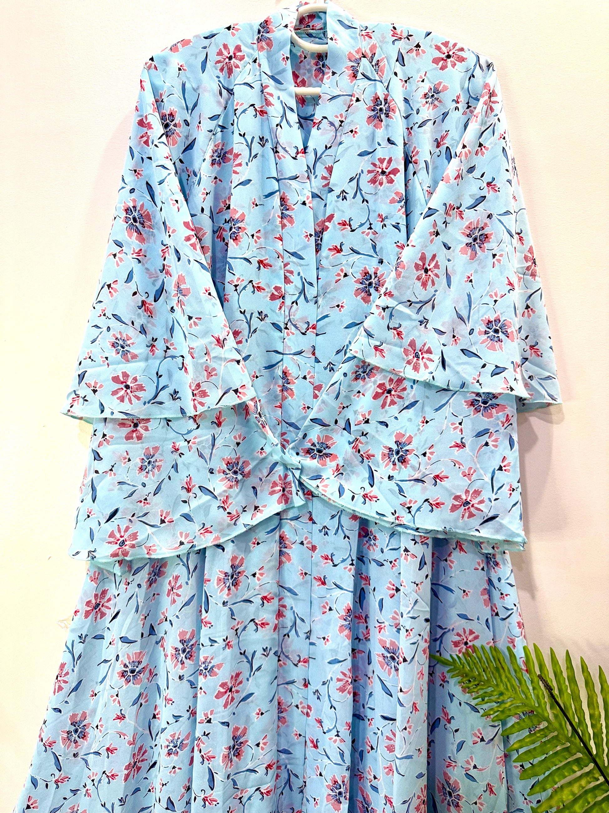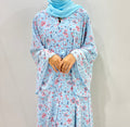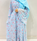 Beautiful floral abaya features a stunning light blue background with a delicate pink floral pattern, creating a soft and elegant look. The long sleeves and flowing design make it perfect for modest wear. The matching light blue hijab adds a touch of simplicity and sophistication. Ideal for formal or casual occasions, this abaya is sure to make a statement.